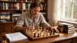 Un autore al lavoro tra scacchiera e appunti, mentre trasforma analisi in spiegazioni, creata con AI.